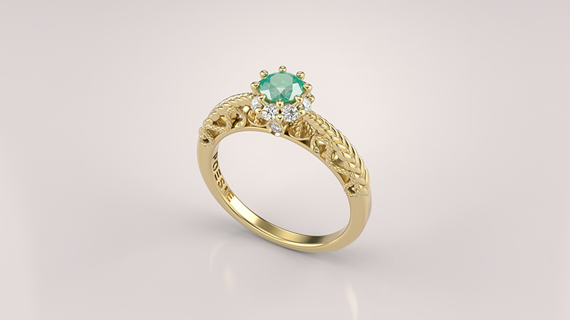 Este modelo é fabricado em ouro 18k, possui 10 diamantes e 1 esmeralda central com peso médio de 0,27ct, totalizando uma quilatagem média de 0,47ct.